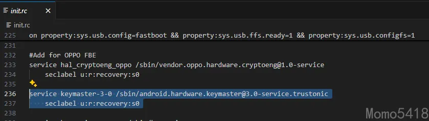 2.可能是init.recovery.cpu代号.rc 未配置keymaster服务 例如: